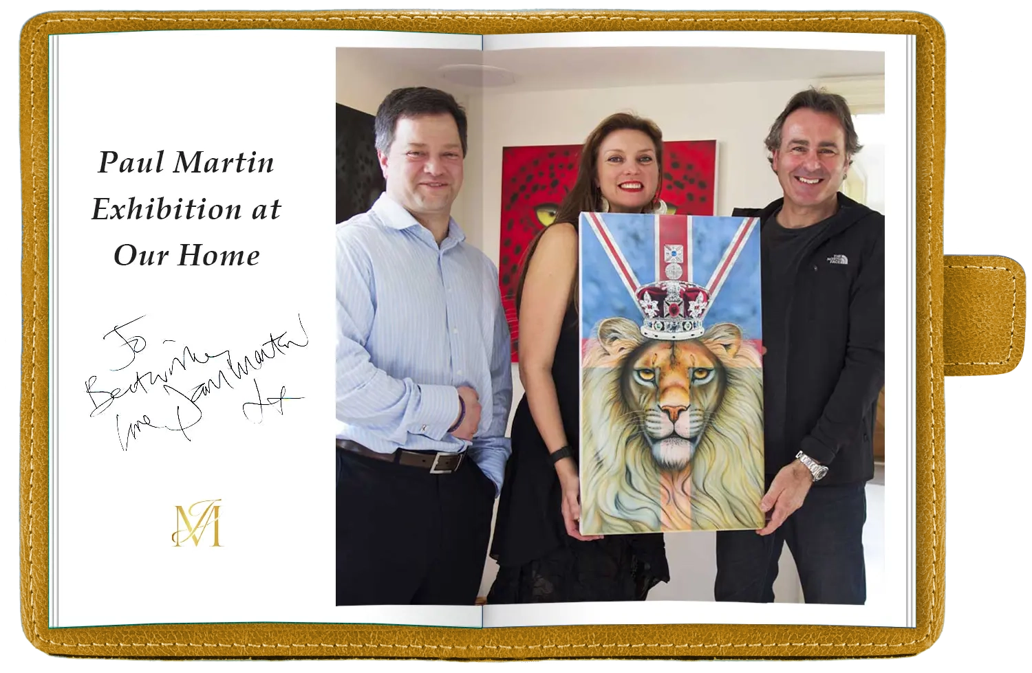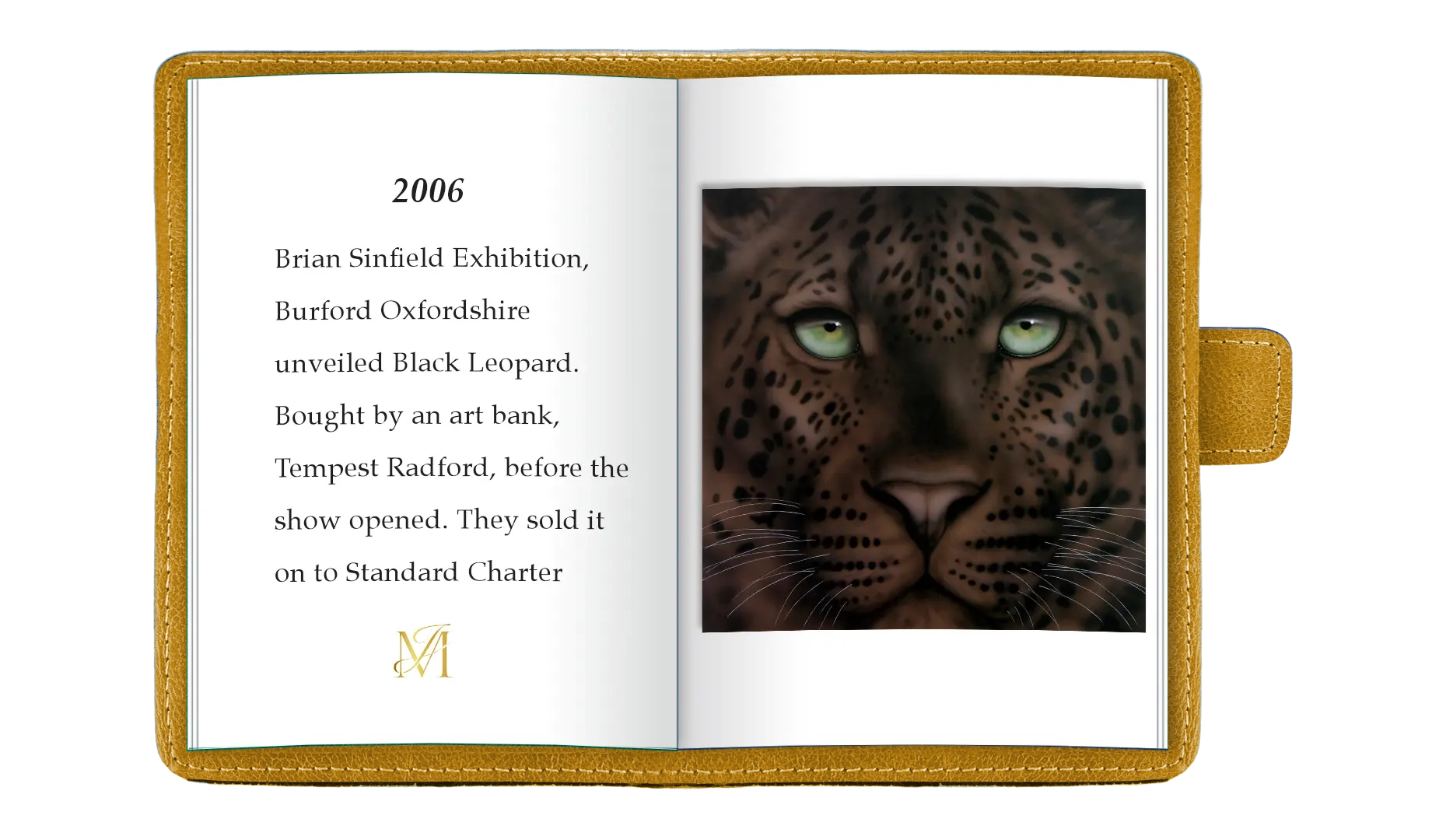 Joanna May held her first solo exhibition at Raymond Blanc, the famous chef’s hotel, Le Manoir Aux Quat’ Saisons. It was attended by the DJ Mike Read and the actress Pam St Clements or more commonly known as Pat Butcher from Eastenders. After producing seven original paintings and one print of the Black Leopard for two of Raymond’s bedroom suites in the hotel, Joanna produced further leopards, tigers and lions in the same format as the Black Leopard but in gold and silver leaf for the exhibition.