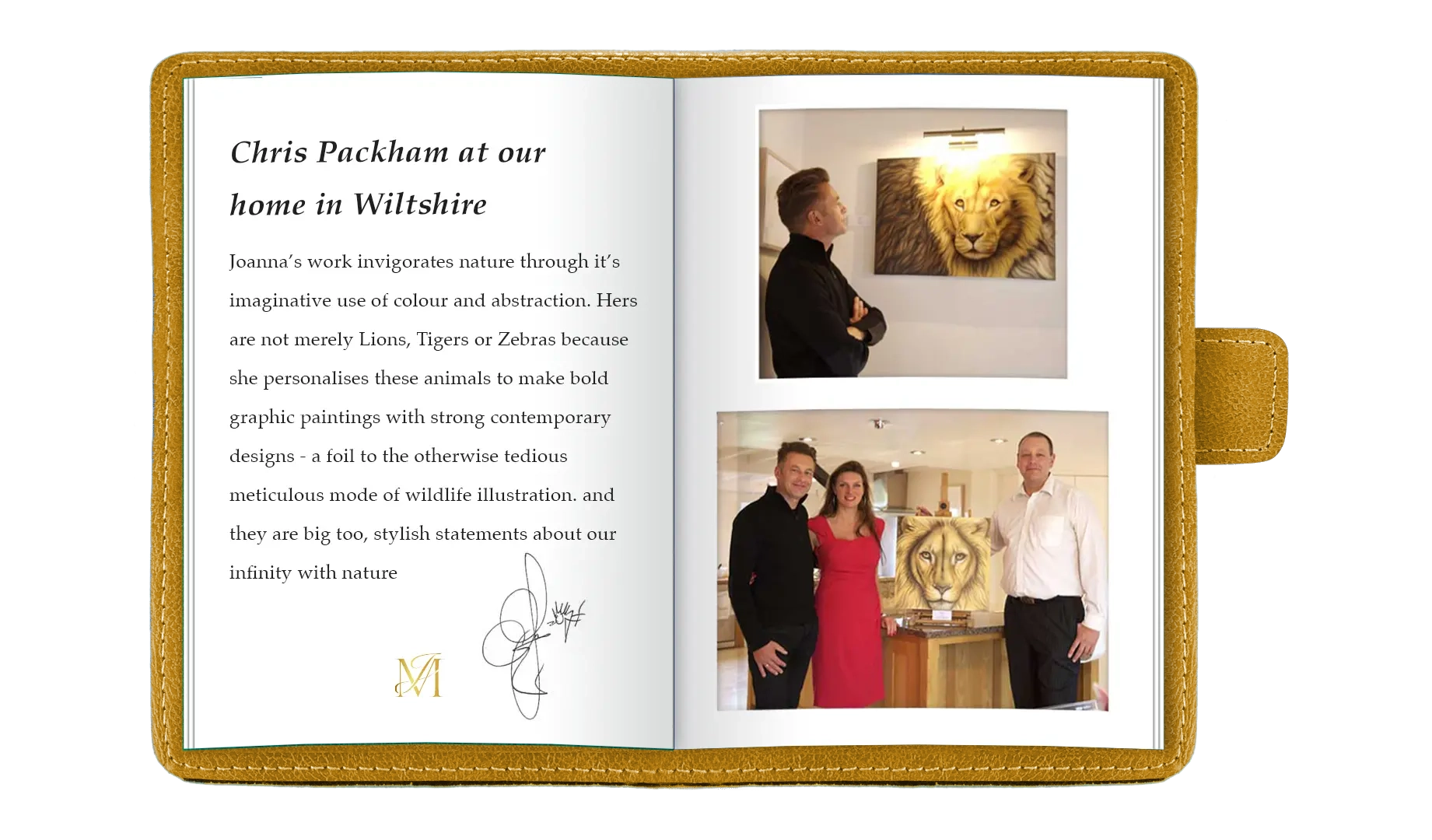 Joanna has appeared on TV, radio, and in many newspaper and magazines articles. In 2012 her work and her beautiful home were featured in the magazine ‘25 Beautiful Homes’. She has worked with many celebrities and wildlife TV presenters to help raise money for conservation and endangered animals raising over £100,000 over the years. She has also worked directly with many conservation groups.