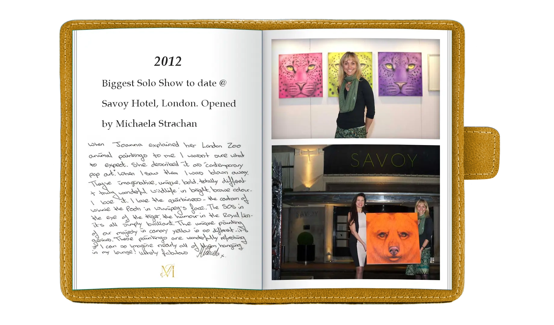 Joanna held a solo exhibition at the Brian Sinfield Gallery in Burford Oxfordshire. The exhibition opened a week after Joanna was on the TV programme Spring Watch talking about why her hare paintings were so popular. The Gemini Hare painting was launched as a start of new series of paintings on the Zodiac and sold before it was aired on TV but was unveiled at this exhibition. After her first African themed paintings were launched at a solo show in London the year before, Brian Sinfield wanted Joanna to paint more of this new style of work but taking the animal pattern to the edge of the canvas like her first Zebra’s. It lead to the launch of her iconic Black Leopard etc. The Black Leopard sold to an art bank called Tempest Radford who sold it on to Standard Charter Bank and the show was a great success launching and selling many more new animals painted in this unique style. The Black Leopard was spotted by Raymond Blanc from a brochure produced for this exhibition and it lead to her selling one of the early prints to Raymond and also being commissioned to paint six more originals for his famous hotel Le Manoir Aux Quat’ Saisons deco style’.