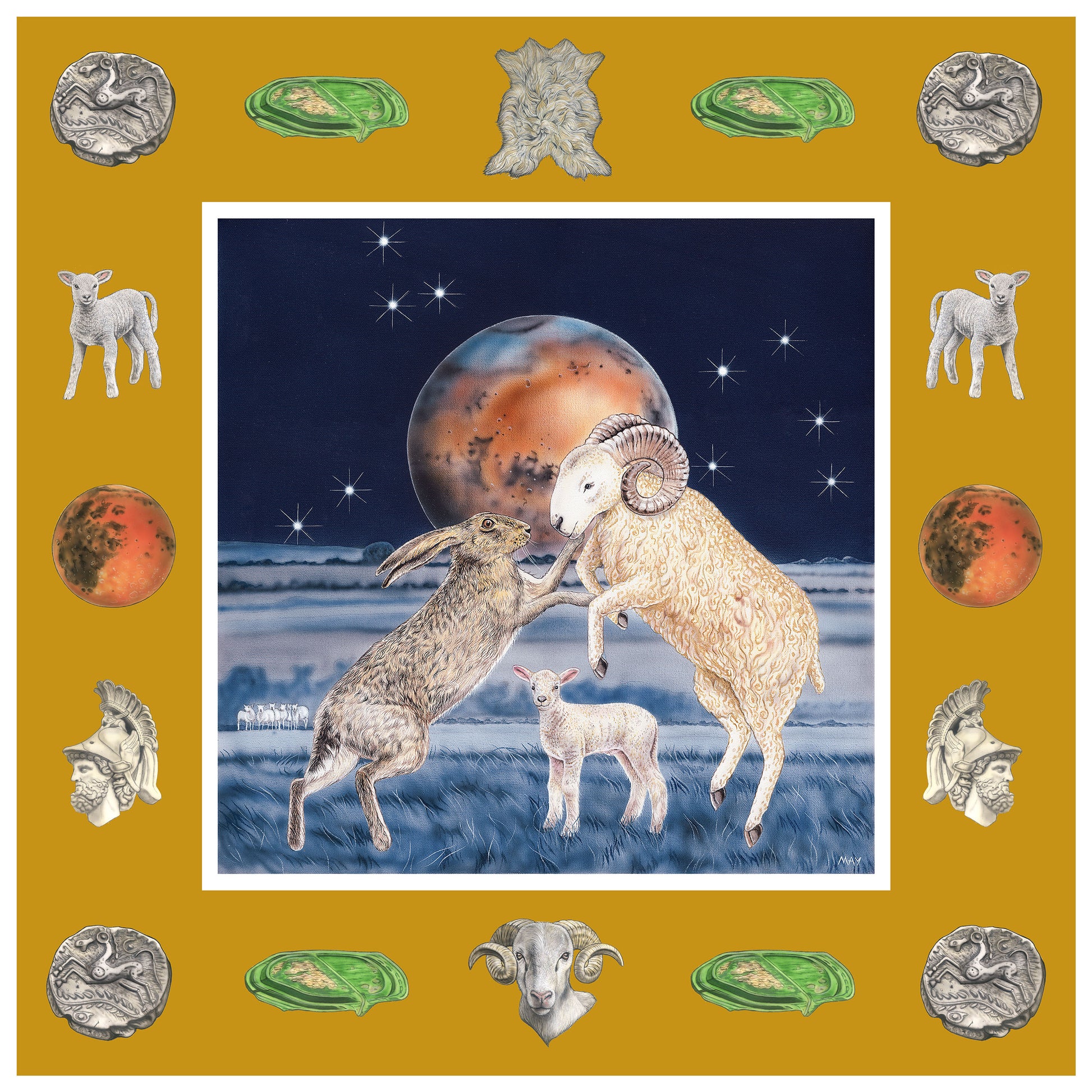 Aries is supposed to have parallels of Ram and Lamb – the force of the Ram and the softness of the Lamb. They meet life’s challenges head on like the Hare and the Ram in combat in the foreground.