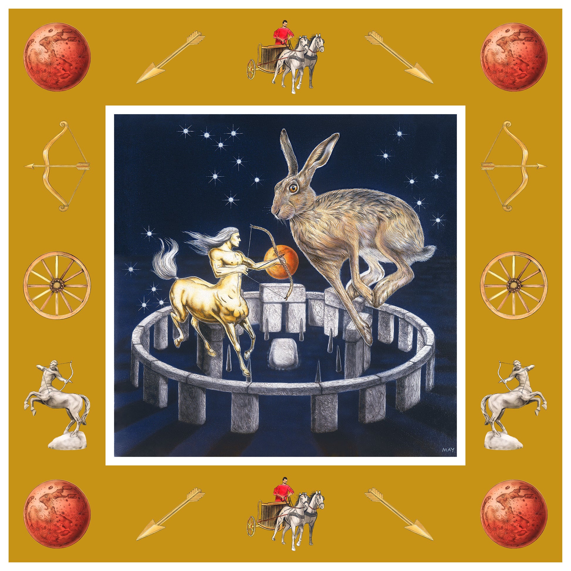 Sag’ is also the Archer so the Centaur is shooting a bow and arrow – he is shooting towards the heart of the hare a cupid arrow of love to freedom which the hare is a totem of.