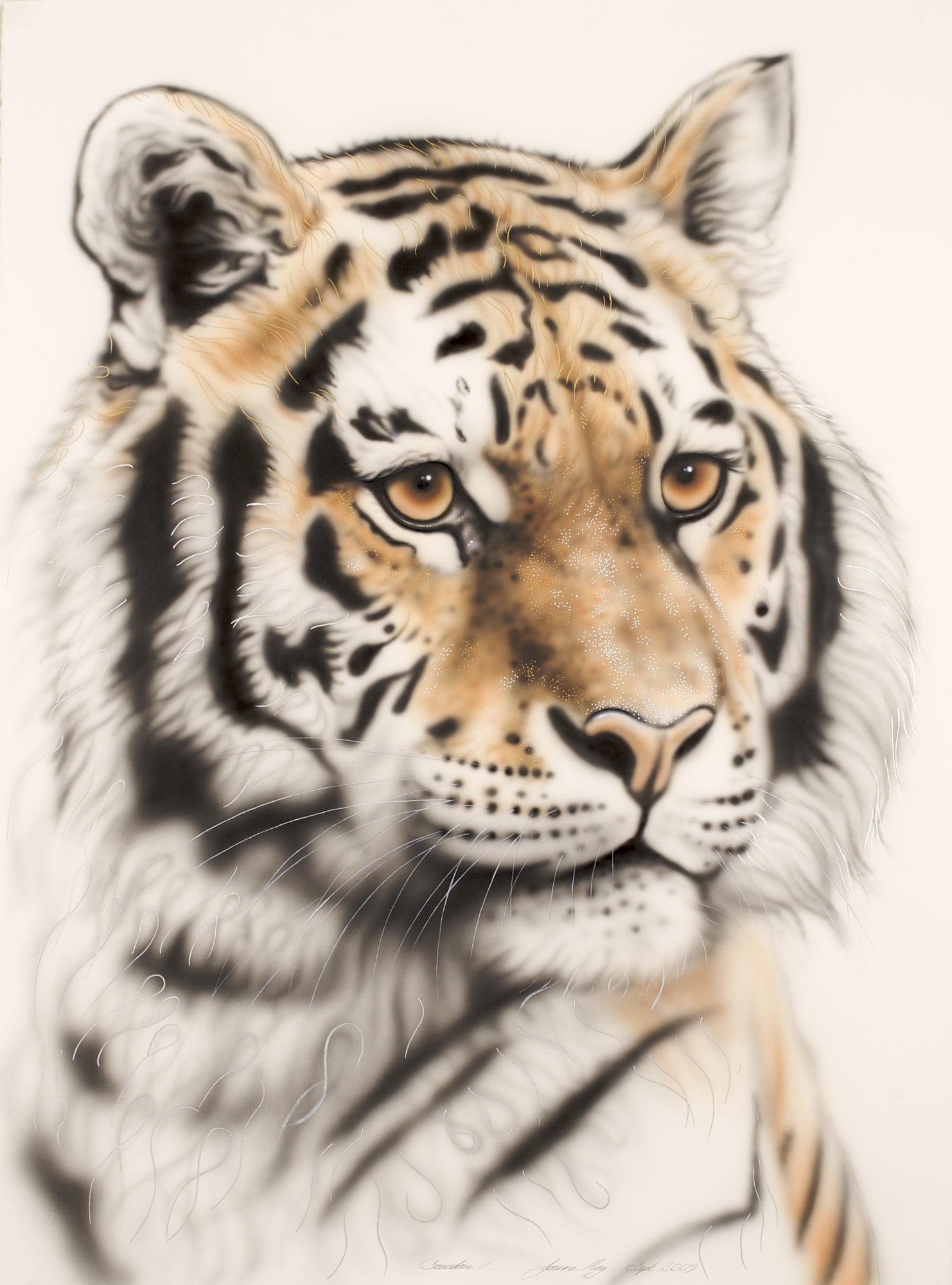 The first original Joanna produced for her Longleat Exhibition was so popular that two clients asked her to do one for them, so she produced two more paintings in different positions, showing the different moods and expressions of Sandari. It is as if the tiger is turning from a profile position to looking at you face on.