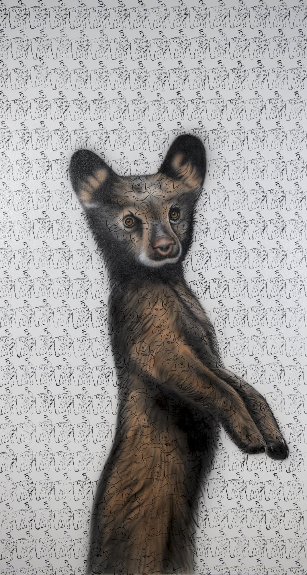 The image of Winnie The Pooh is used with the kind permission of The Disney Corporation and Joanna has incorporated Dancing Winnie the Pooh’s in the fur detail of the young bear. In the background there is a stencil image of Harry Colebourn feeding Winnipeg, the stencils outline is taken from the old black and white photograph.